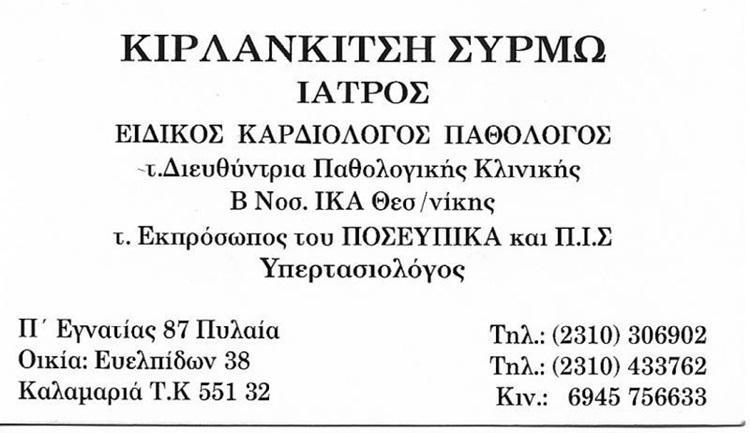 ΕΙΔΙΚΗ ΠΑΘΟΛΟΓΟΣ ΚΑΡΔΙΟΛΟΓΟΣ ΥΠΕΡΤΑΣΙΟΛΟΓΟΣ | ΠΥΛΑΙΑ ΘΕΣΣΑΛΟΝΙΚΗ | ΚΙΡΛΑΝΚΙΤΣΗ ΣΥΡΜΩ