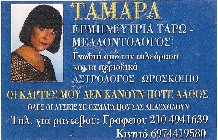 ΤΑΜΑΡΑ ΜΕΛΛΟΝΤΟΛΟΓΟΣ, ΜΕΝΤΙΟΥΜ, ΧΑΡΤΟΜΑΝΤΕΙΑ ΣΤΗ ΝΙΚΑΙΑ. ΜΕΝΤΙΟΥΜ – ΜΕΛΛΟΝΤΟΛΟΓΟΣ ΕΡΜΗΝΕΥΤΡΙΑ XAL. ΓΝΩΣΤΗ ΑΠΟ ΤΗΝ ΤΗΛΕΟΡΑΣΗ ΚΑΙ ΤΟ ΠΕΡΙΟΔΙΚΟ ΑΣΤΡΟΛΟΓΟΣ. ΟΙ ΚΑΡΤΕΣ ΜΟΥ ΔΕΝ ΚΑΝΟΥΝ ΠΟΤΕ ΛΑΘΟΣ. ΟΛΕΣ ΟΙ ΛΥΣΕΙΣ ΓΙΑ ΤΑ ΠΡΟΒΛΗΜΑΤΑ ΠΟΥ ΣΑΣ ΑΠΑΣΧΟΛΟΥΝ. ΔΥΝΑΤΗ ΠΡΟΒΛΕΨΗ ΜΕΣΩ ΤΗΛΕΦΟΝΟΥ ΚΑΤΟΠΙΝ ΑΝΤΙΚΑΤΑΒΟΛΗΣ